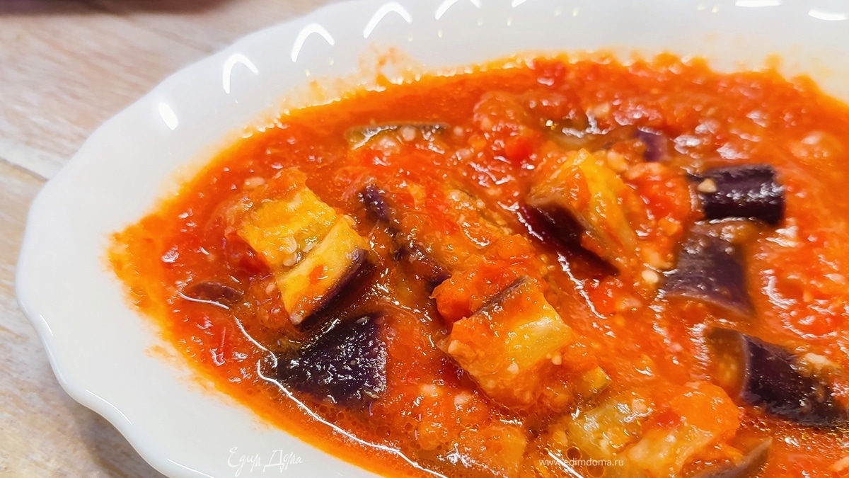 Баклажаны помыть, очистить от хвостиков. Нарезать крупным кубиком. Добавить их к маринаду и варить на среднем огне 20 минут. В самом конце добавить десертную ложку уксусной эссенции (в перечне не было десертной ложки, поэтому указала как чайную). - Шаг 3