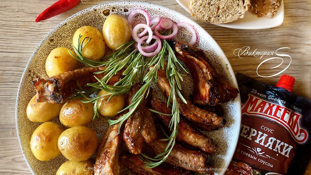 Подавайте ребрышки с молодым картофелем бэби, маринованным лучком, зеленью или салатом. Приятного вам аппетита!