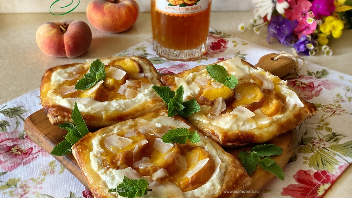 Затем по 1 ст. л. джема ТМ «МАхеевъ», сверху уложите дольки персика и посыпьте кокосовой стружкой (у меня кокосовые кранчи). Бортики смажьте яйцом (можно только желтком). Поставьте в духовку, разогретую до 200°C минут на 35–40 до золотистой корочки. - Шаг 6