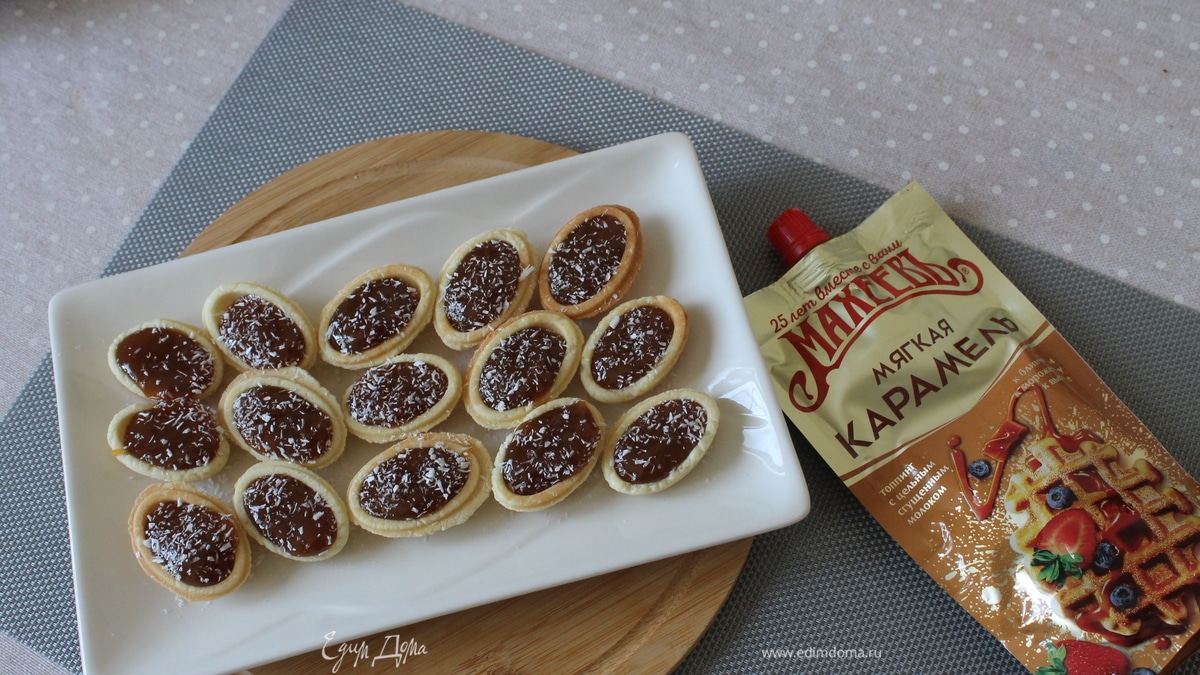 В скорлупки положить необходимое количество начинки. В качестве начинки я использовала топинг «Мягкая карамель»ТМ «Махеевъ». Выкладываем красиво на блюдо, украшаем по своему вкусу. Я посыпала кокосовой стружкой. Можно по желанию в каждый положить по орешку, тоже будет очень вкусно. - Шаг 16