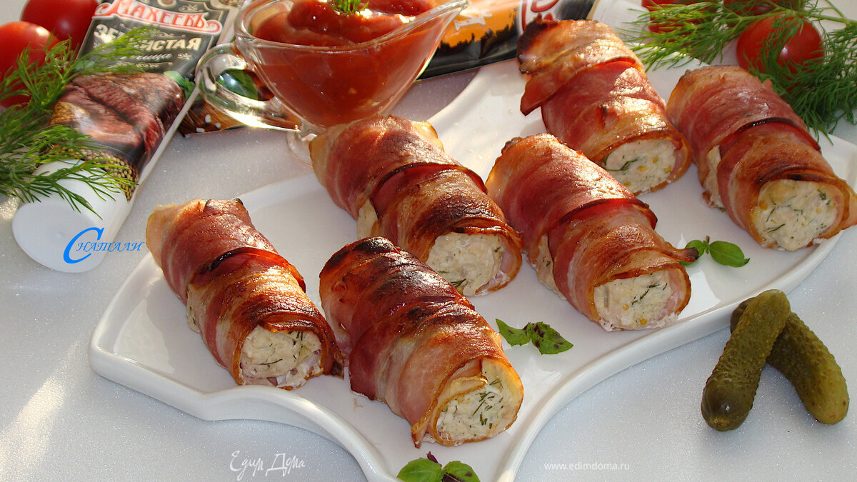 Фарш разделите на 9 одинаковых частей. Две полоски бекона уложите на доску. Влажными руками из фарша сформируйте лепешку. Вложите внутрь корнишон и сформируйте котлету. Котлету положите на один край полосок из бекона и заверните рулетиком. - Шаг 4