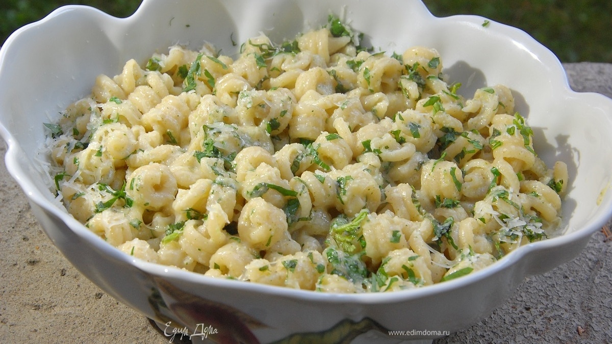 Переложить пасту в глубокую миску, посыпать измельченной зеленью и оставшимся сыром.