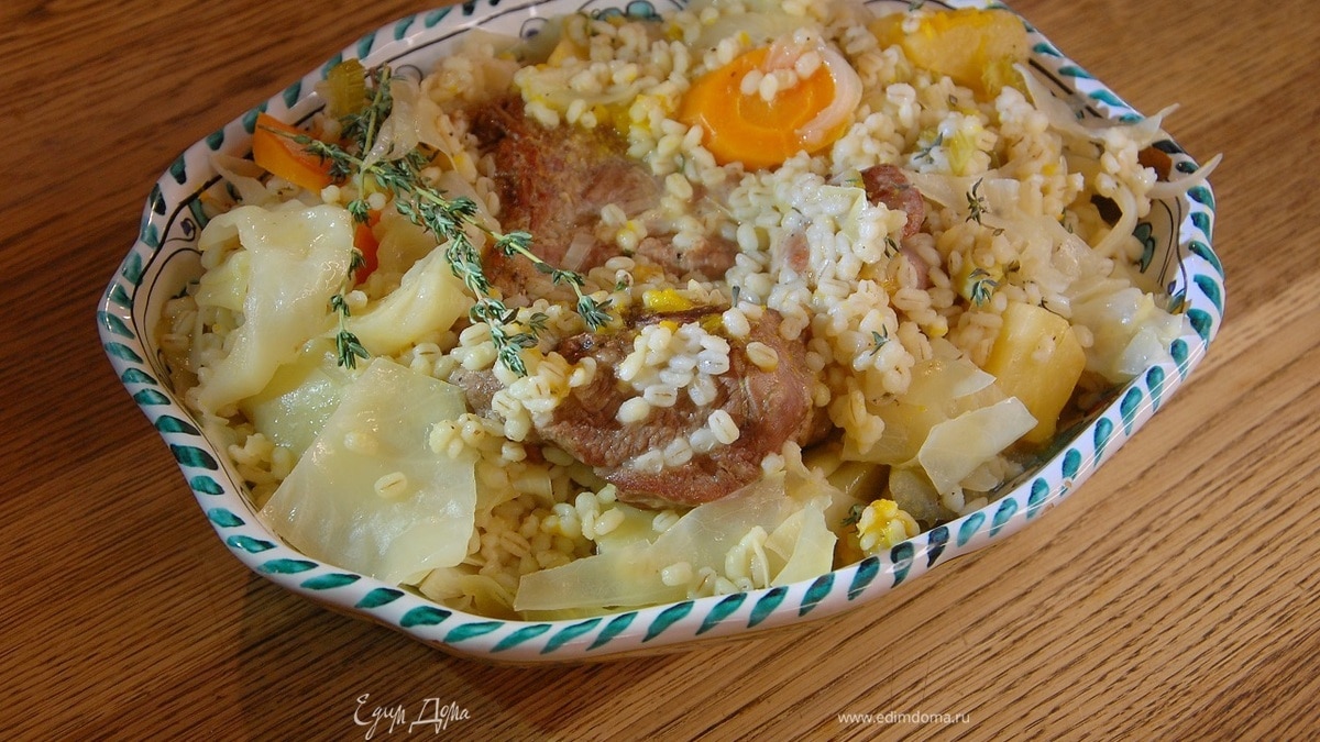 К обжаренным овощам добавить пару веточек тимьяна, лавровые листья, слегка посолить, поперчить и перемешать, сверху поместить обжаренное мясо, репу, корень пастернака и тыкву, всыпать перловку, накрыть капустой, еще раз посолить, влить оставшееся растительное масло и горячий овощной бульон, так чтобы все было покрыто до капусты, и томить на программе «тушение мяса» до готовности. - Шаг 7
