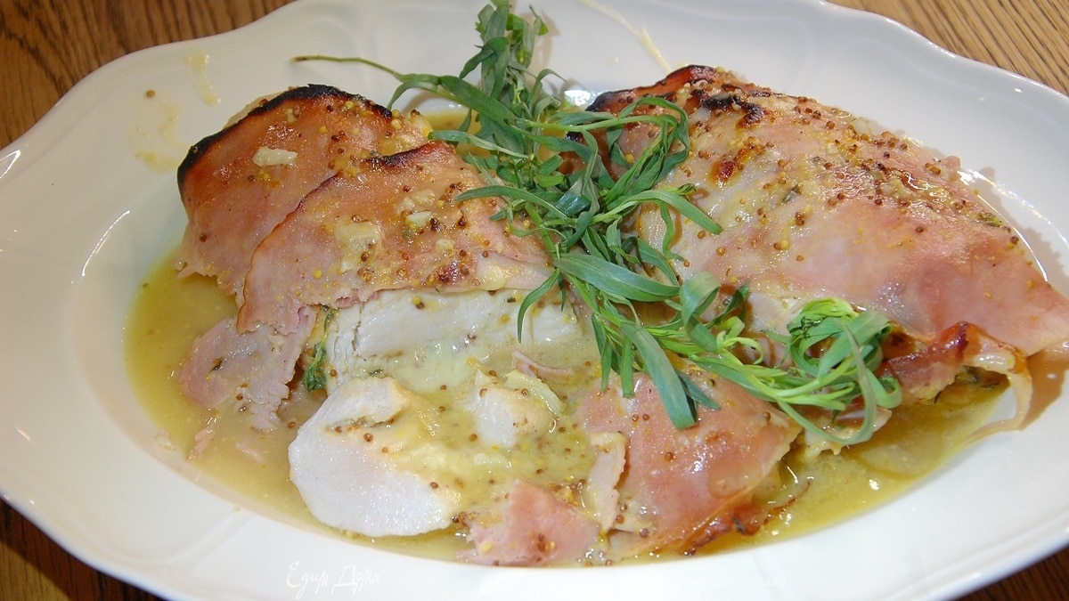 Готовые грудки выложить на тарелку, полить оставшимся после запекания соусом и украсить веточкой тархуна.