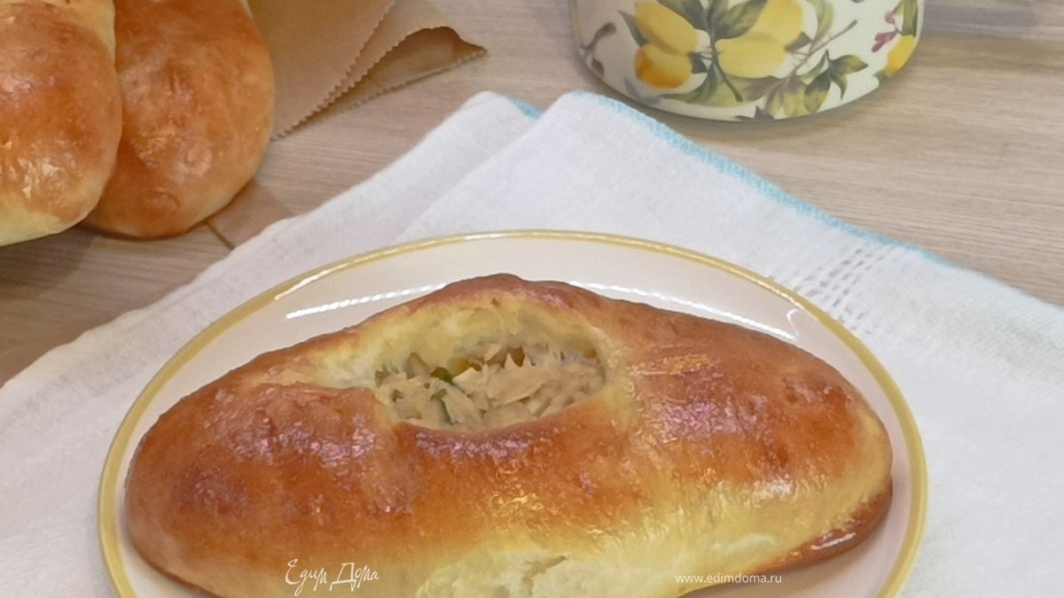 Подошедшее тесто разделить на 10 кусочков. Каждый раскатать в овальную лепешку, в середину выложить по полной столовой ложке начинки и придать характерную для расстегаев форму лодочки с отверстием. - Шаг 10