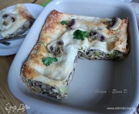 Лазанья готова. Можно ее украсить по своему усмотрению, у меня здесь один нарезанный и обжаренный на сковороде шампиньон, ножка которого посыпана итальянскими травами.