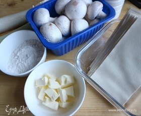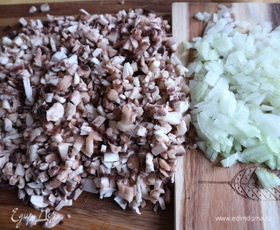 Приготовить дюксель. Репчатый лук почистить, мелко нарезать. Шампиньоны почистить от загрязнений, ополоснуть, мелко нарезать.