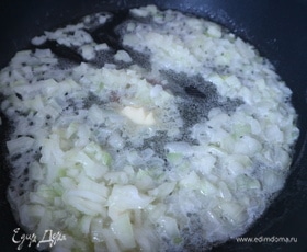 Разогреть сковороду с оливковым и сливочным маслом, поместить в нее репчатый лук, обжарить до прозрачности.