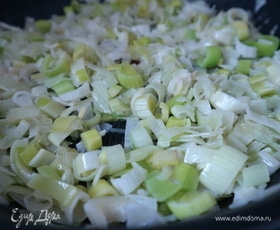 Нарезать порей, сначала вдоль на две части, потом половинками колечек. На сковороду поместить оливковое и сливочное масло, разогреть сковороду, слегка обжарить порей, чтобы он стал мягким, но не зажаренный, на это потребуется несколько минут. Посолить, перемешать.