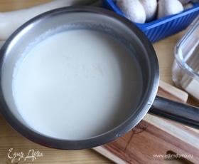 Довести смесь до легкого кипения на умеренном огне, добавить соль, мускатный орех. Смесь процедить через сито. Дать остыть. Бешамель готов. Накрыть сотейник крышкой.