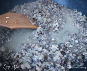 Добавить шампиньоны. Нам требуется выпарить жидкость на небольшом огне, в конце этого процесса добавить соль, перец, белое сухое вино, выпарить жидкость.