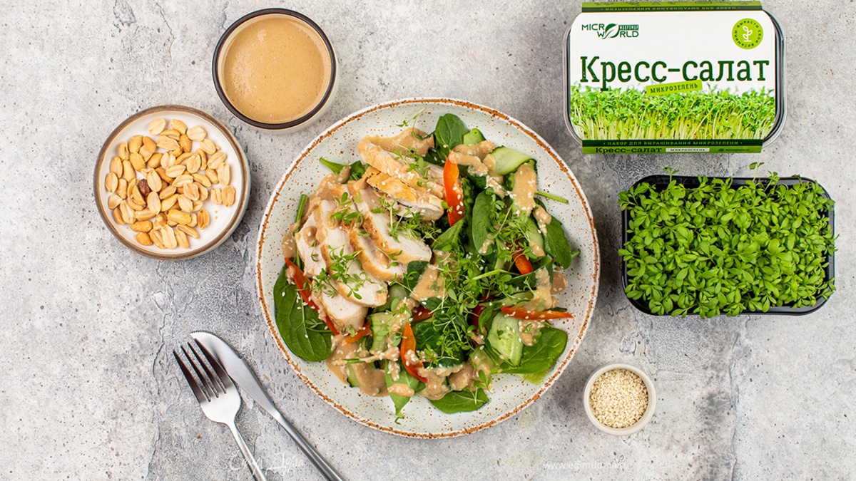 Салат с куриной грудкой, ореховым соусом и микрозеленью