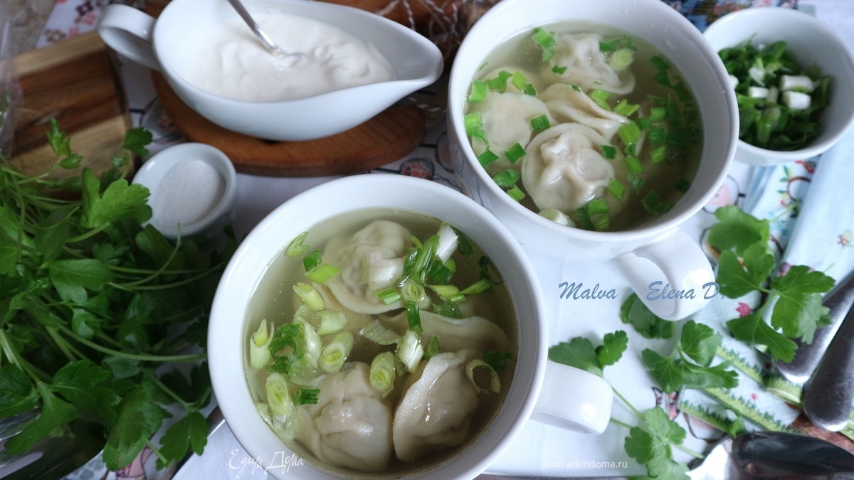 Достать пельмени из морозильной камеры. Бульон разделить на две части. Одну часть бульона довести до кипящего состояния и сварить пельмени, так они будут особенно вкусны. Варить 6–7 минут, до готовности. Другую часть горячего бульона использовать для подачи. Можно дополнить зеленью укропа, петрушки, зеленого лука. - Шаг 14