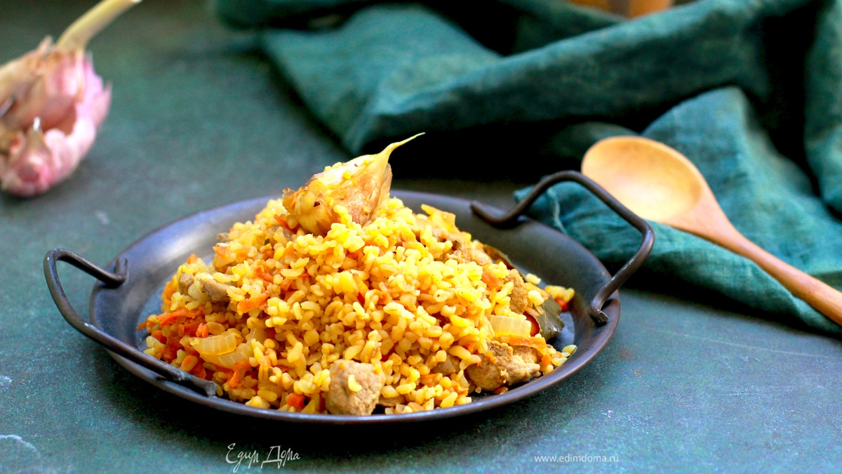 Булгур — очень удачная крупа, она не разваривается, даже если переварить, и этим выгодно отличается от риса. Рекомендую ее для блюд в стиле плов или пилав, мясо можете брать любое, овощи добавлять любые из наличия. Я добавляла классически морковь, лук и чеснок.