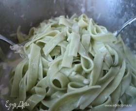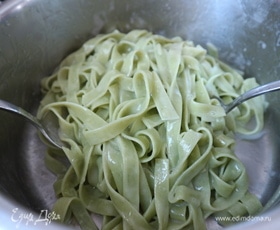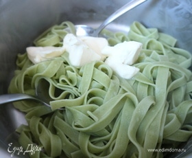 Феттучине опустить в кипящую подсоленную воду из расчета 100 грамм пасты на 1 литр воды, варить до состояния al dente. У меня для этого потребовалось 5 минут, т. к. паста со шпинатом свежая, а не высушенная, ей требуется чуть меньше времени для варки. Слить воду из кастрюли с пастой, оставив в отдельной посуде 0,5 стакана воды от пасты, она пригодится для соуса. Кастрюлю держать на небольшом огне. Добавить сливочное масло к пасте, тщательно и аккуратно перемешать.