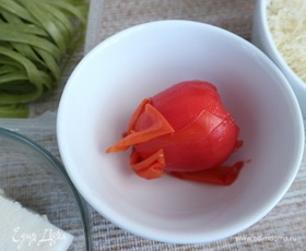 У плодоножки помидора нанести крестообразный разрез, поместить в кипяток на 20–30 секунд, снять шкурку.