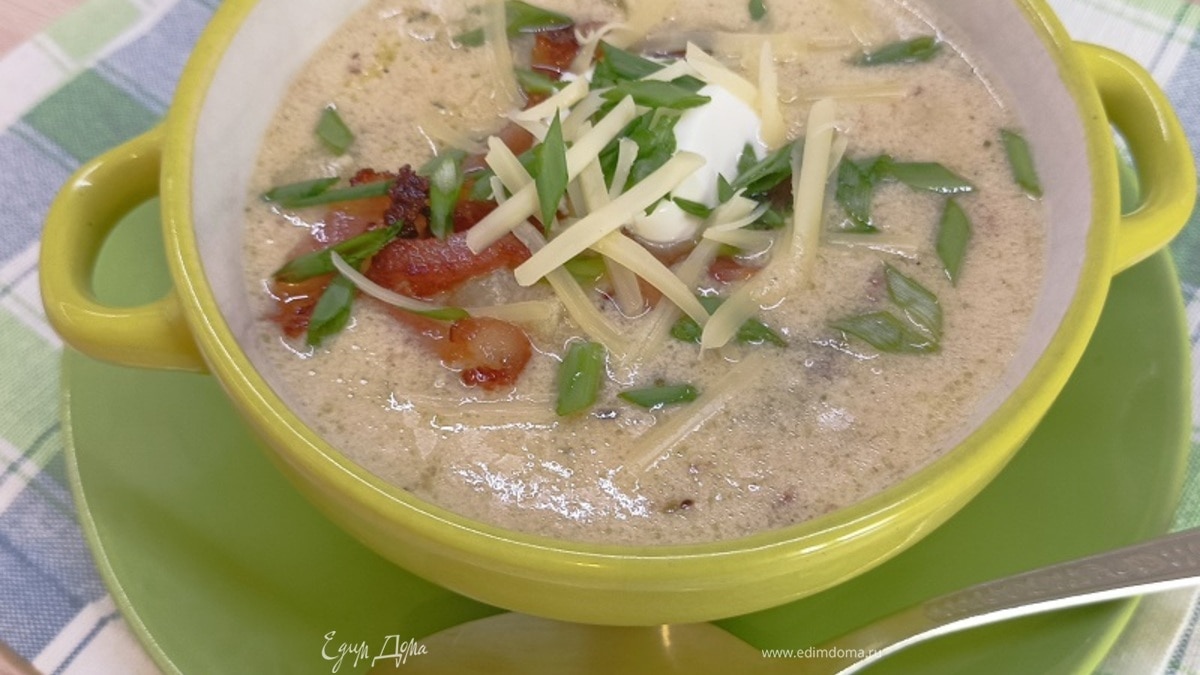 Этот насыщенный суп с жареным картофелем порадует всю вашу семью! Густой, сытный и очень вкусный, с сыром чеддер, беконом, сметаной и зеленым луком.