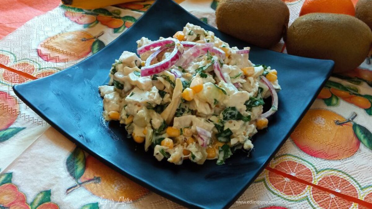 Вареную куриную грудку нарезаем некрупным кубиком. Перекладываем в миску. Таким же кубиком режем ананасы. Добавляем нарезанные консервированные шампиньоны, кукурузу и лук. Все перемешиваем. Солим и перчим по вкусу. - Шаг 3