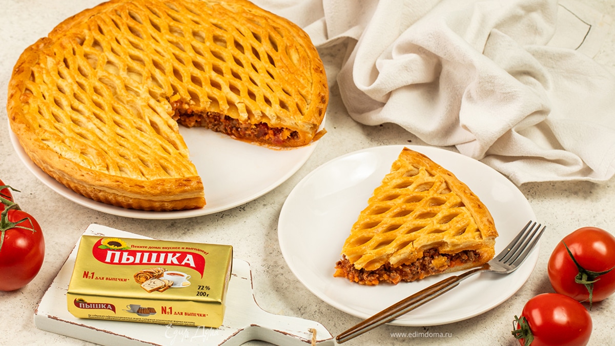 Посыпьте рабочую поверхность мукой и раскатайте вторую часть теста в пласт толщиной 3 мм, переложите в форму для запекания, выложите начинку из фарша, при необходимости обрежьте края. - Шаг 13