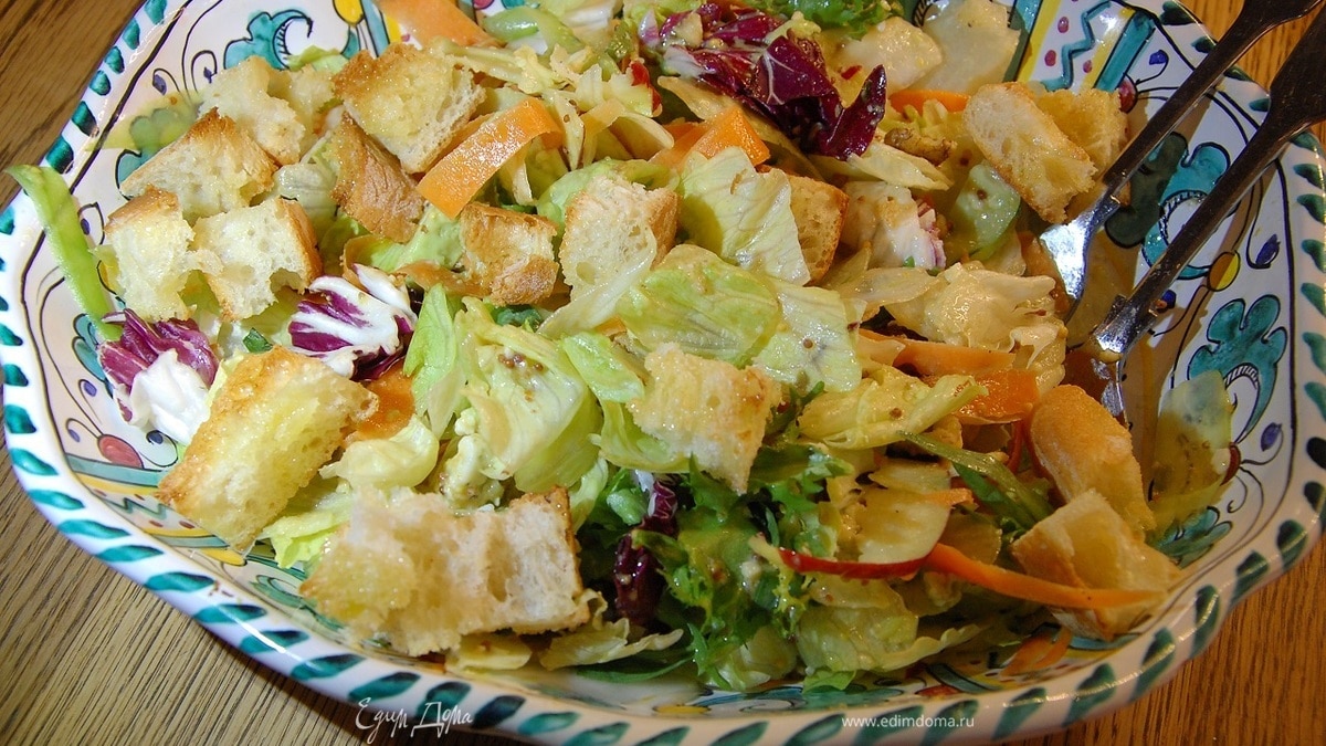 Чиабатту нарезать ломтиками и подсушить в тостере, затем полить оставшимся оливковым маслом, нарезать небольшими кусочками и выложить на салат.