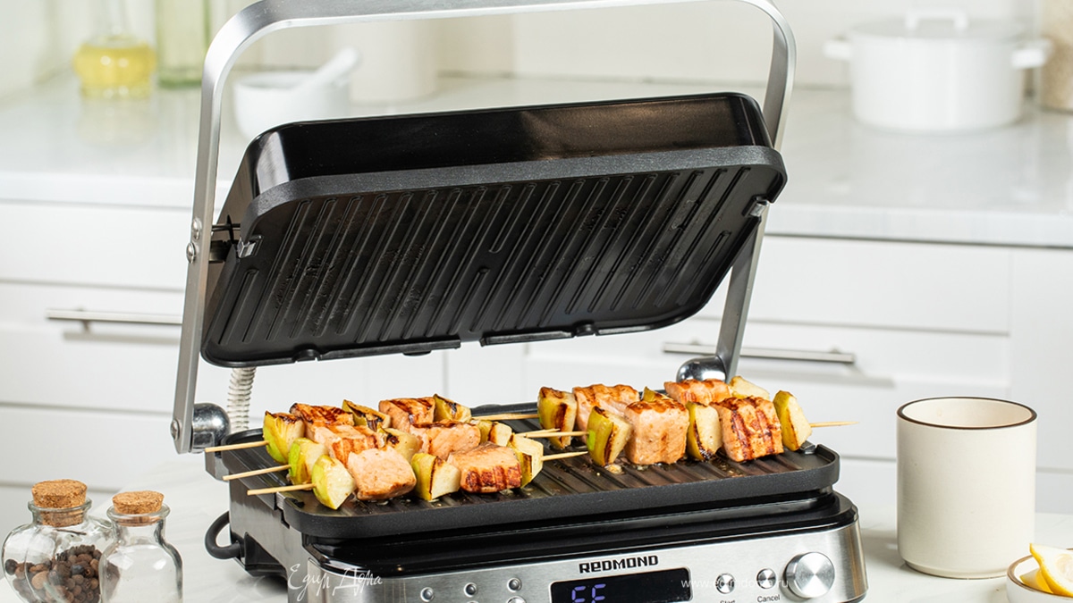 Обжарьте шашлычки на гриле REDMOND SteakMaster RGM-M819D до золотистой корочки в течение 5–7 минут. Не забудьте несколько раз повернуть шпажки, чтобы угощение пропеклось равномерно. - Шаг 10