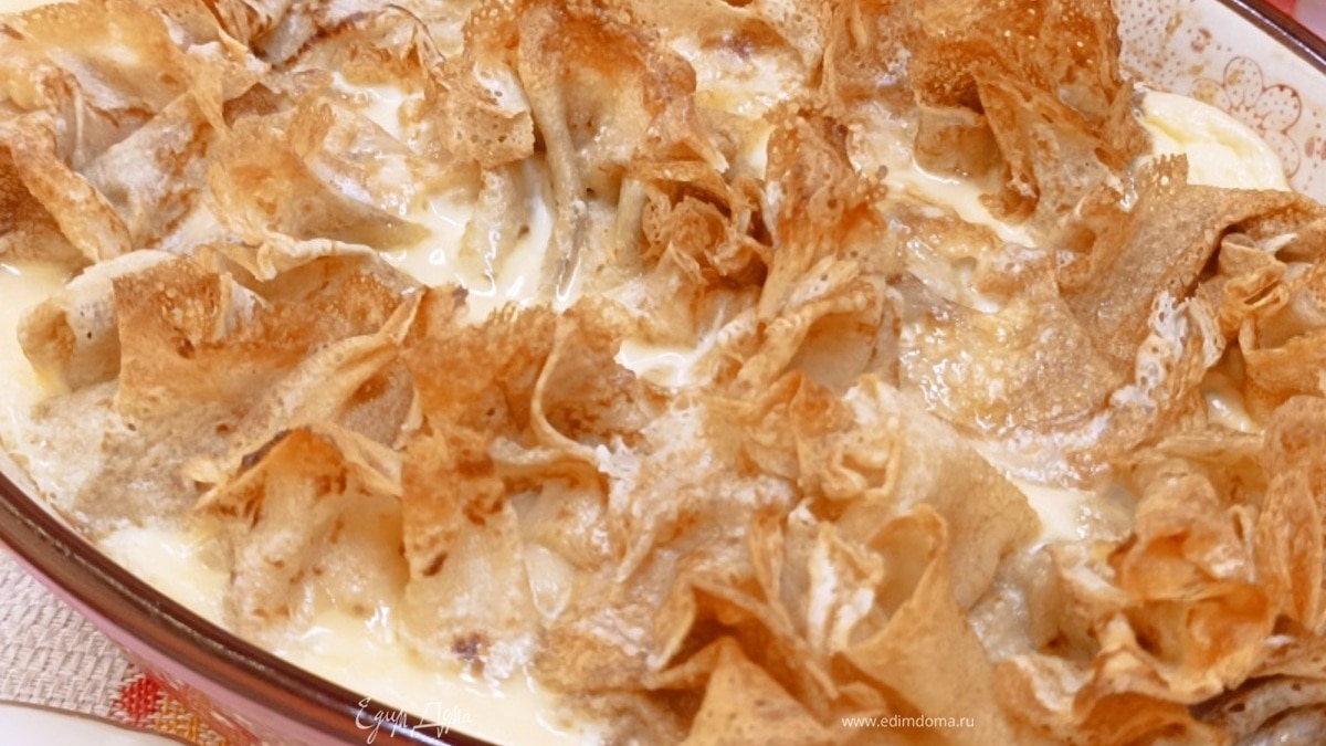Запекаем в духовке 20–25 минут при 200°C. Я из страха, что края блинчиков подгорят, положила сверху кусочек фольги. Убрала через 15 минут и продолжила запекать. Нам ведь нужно, чтобы только заливка схватилась. - Шаг 5