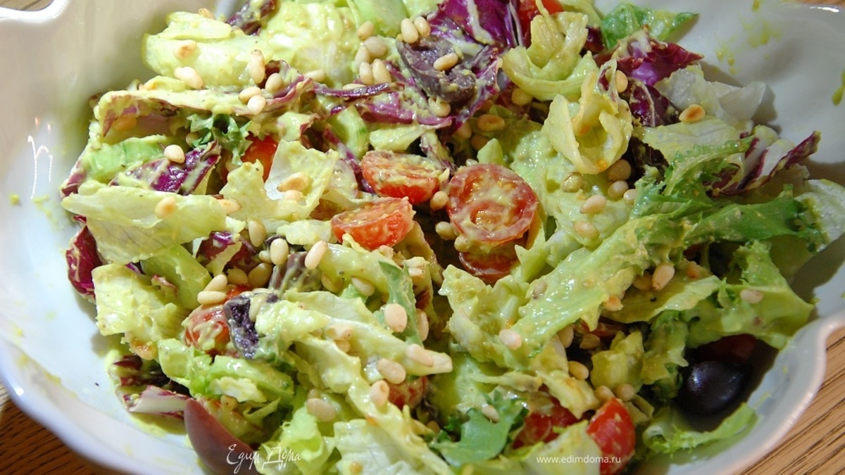 Салат из свежих овощей с оливками, орехами и майонезом из авокадо