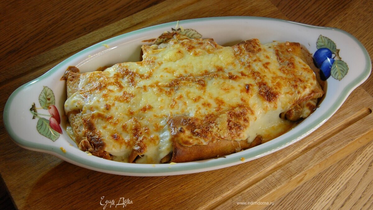Блинчики с куриной печенью и анчоусами под соусом бешамель