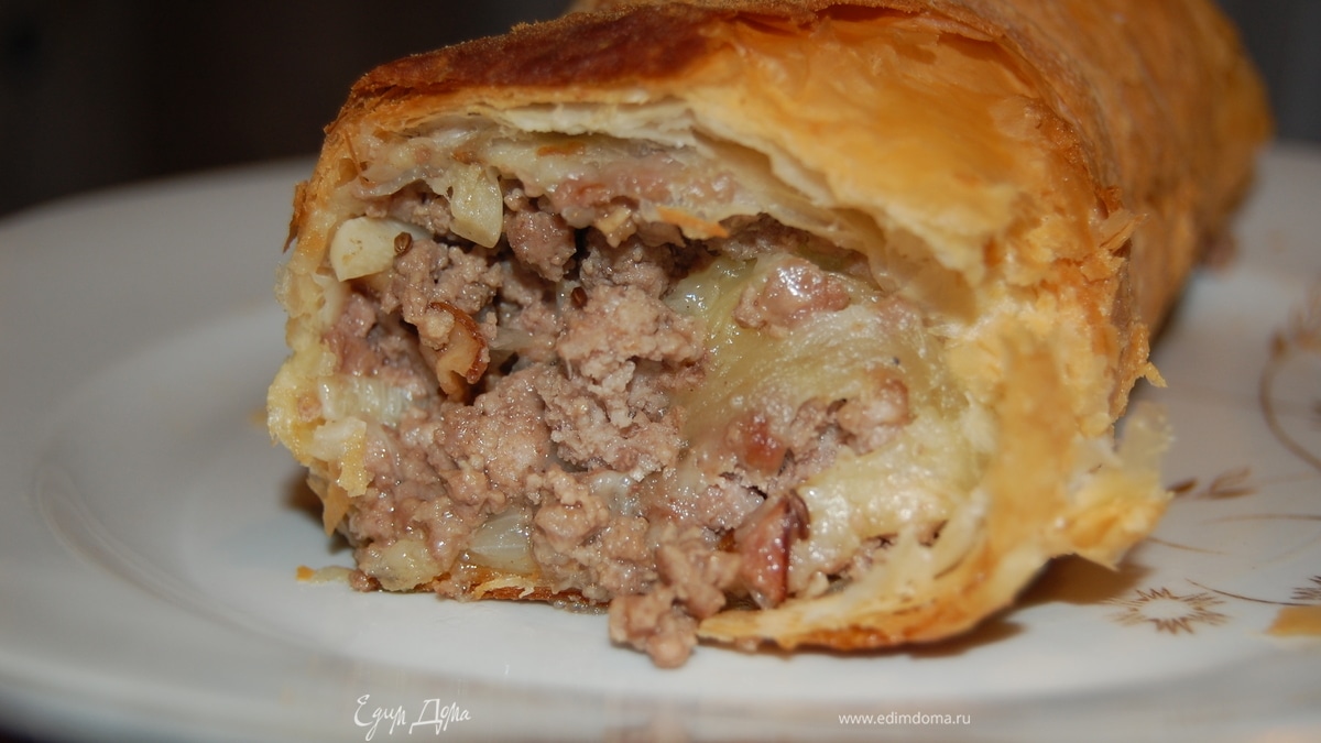 Раскатываем наше тесто, выкладываем на него фарш, который успел немного остыть,закатываем все в не слишком тугой рулет. - Шаг 3