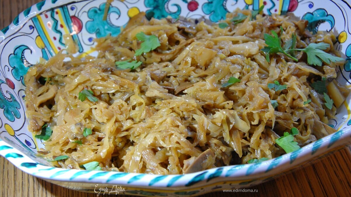 Капусту мелко нашинковать, выложить в чашу мультиварки, влить жидкость, в которой замачивались грибы, добавить обжаренный лук с грибами, все посолить и перемешать.
