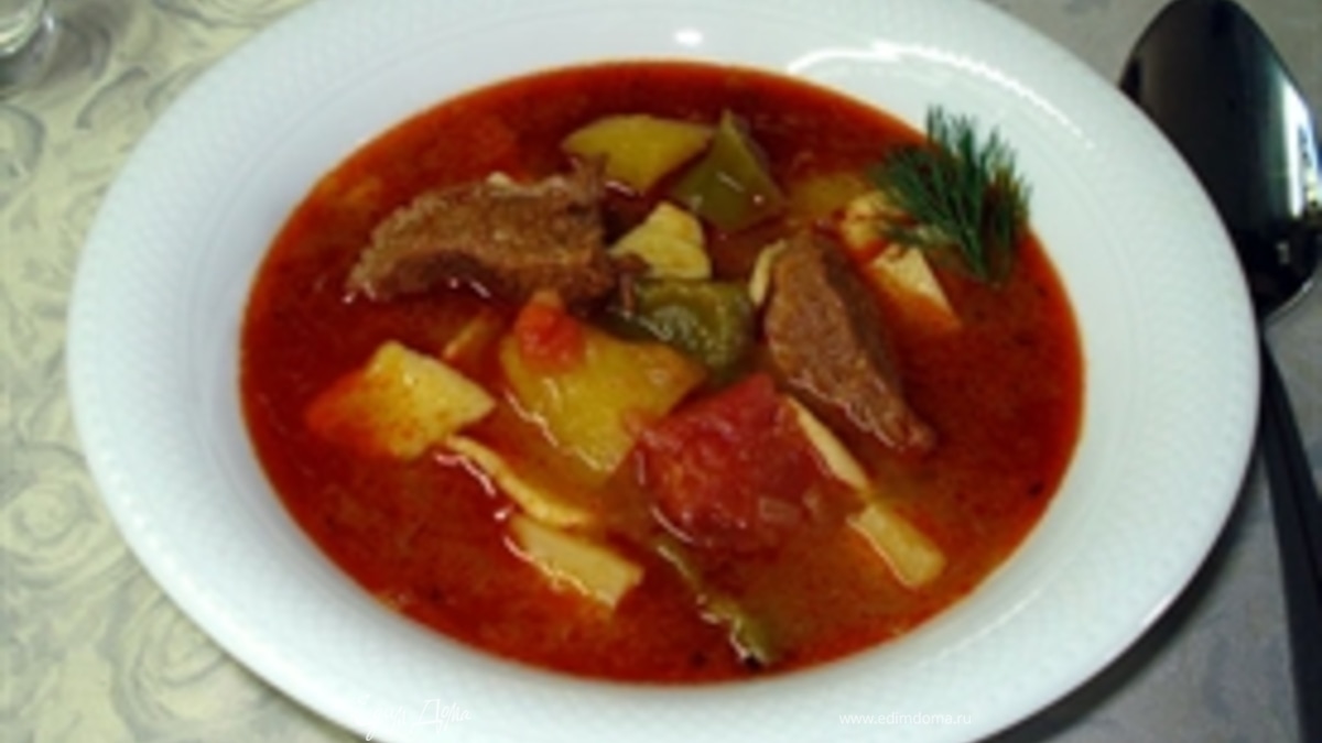 - Шаг 1Сочное мясо со множеством cухожилий нарезать кубиками со стороной 1, 5-2 см.В растопленном жире поджарить до золотистого цвета мелко нарезанный лук. Уменьшить огонь, положить в не слишком горячий жир паприку, быстро перемешать, тотчас же добавить мясо, добавить растолченный чеснок, смешанный с тмином, прилить немного воды и, изредка помешивая, продолжать тушить на слабом огне. При необходимости добавлять воду, но всегда понемногу, чтобы мясо не варилось, а тушилось в малом количестве жидкости.