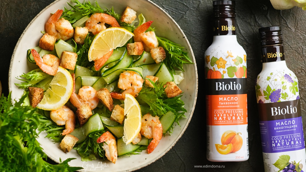 Предварительно размороженные сырые креветки пожарьте на виноградном масле Biolio. Готовьте морепродукты по 3 минуты с каждой стороны. В процессе посолите. - Шаг 4