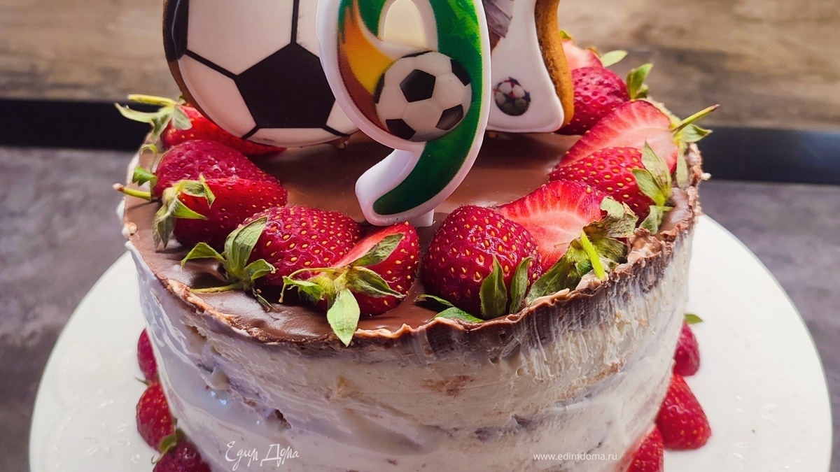 Верхний корж можно украсить кремом и посыпать крошкой от коржей. Или можно залить шоколадной глазурью и украсить на свой вкус. - Шаг 6