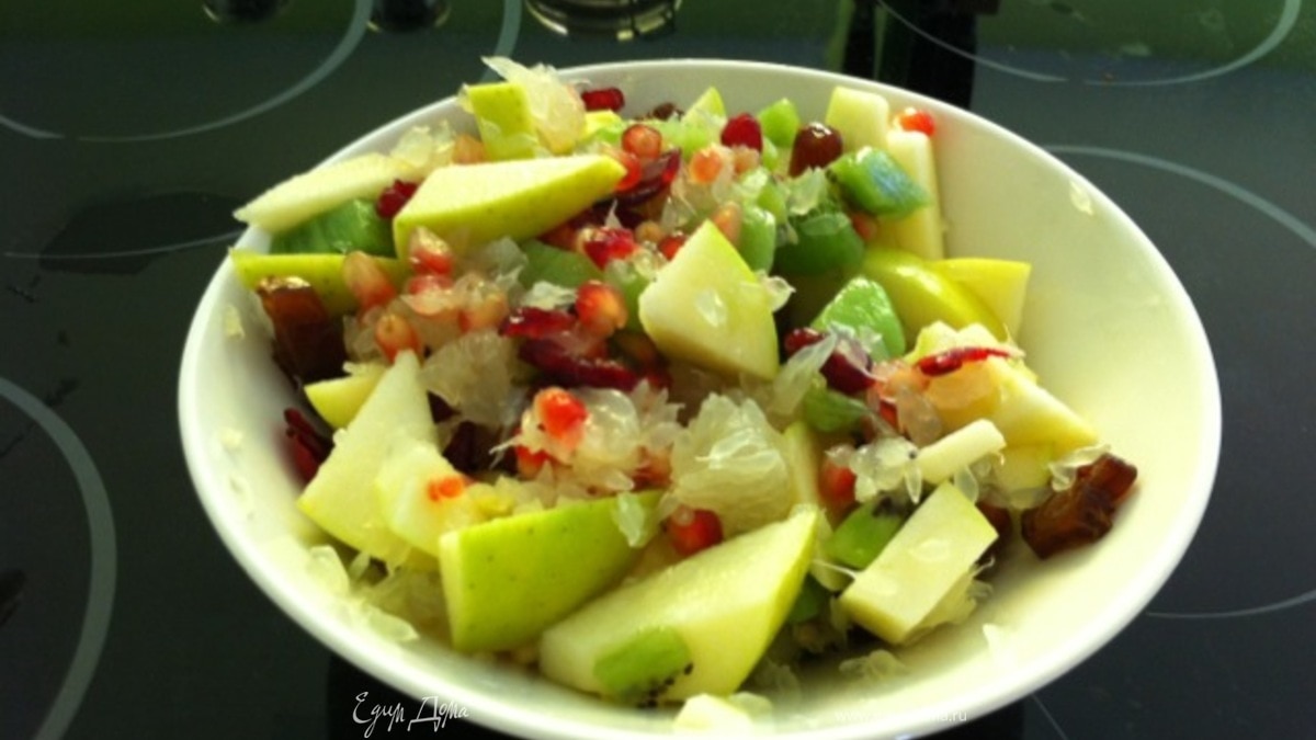 - Шаг 1Очистите все фрукты и нарежьте яблоки и киви, мякоть свити положите сверху (пока вы чистите гранат яблоки и киви маринуются). Порежьте сухофрукты. Посыпьте салат зернами граната, кусочками сушеной клюквы и вишни и фиников, сбрызните лимоном и припудрите порошком корицы! Вся палитра восточного базара у вас на губах!