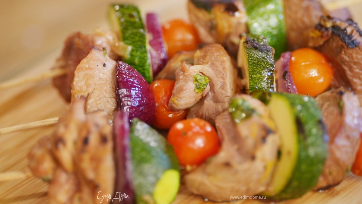 Шашлычки из индейки с цукини, красным луком и помидорами черри