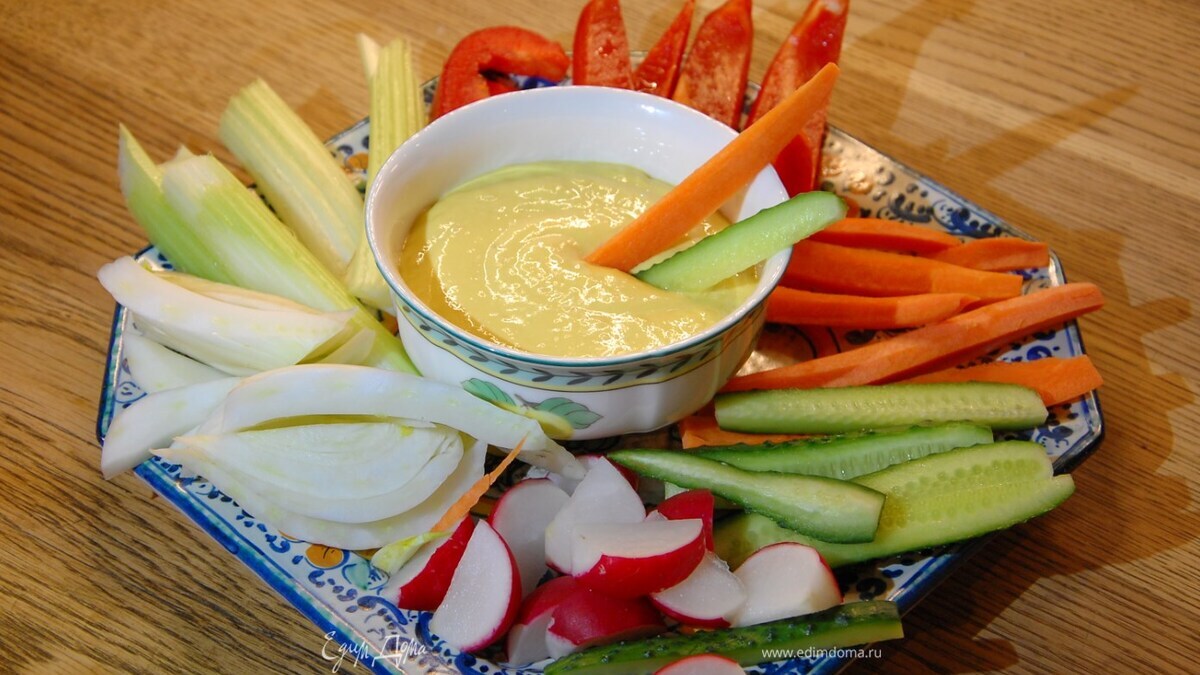 Подготовленные овощи выложить на тарелку, в центр поместить пиалу с соусом айоли.