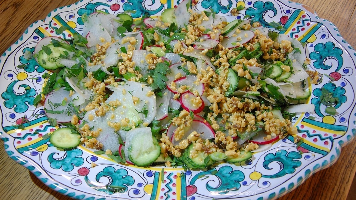 Салат из дайкона, огурцов и редиса с карамельным арахисом