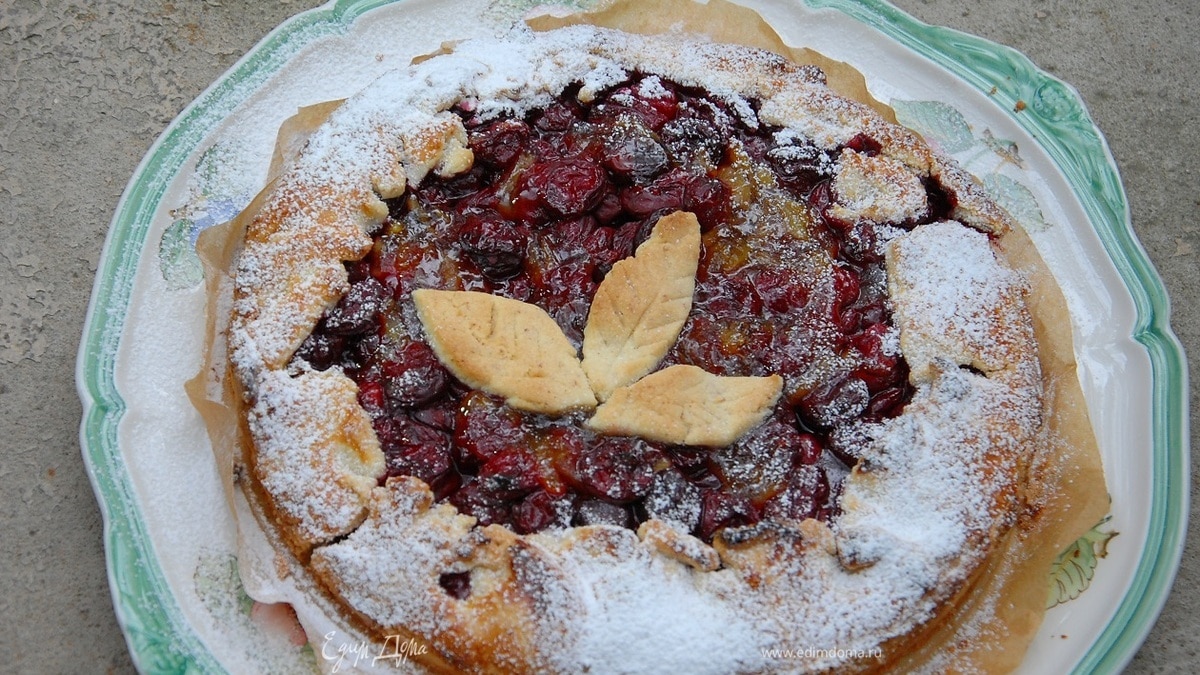 Охлажденное тесто присыпать половиной сахара, выложить вишню и посыпать оставшимся сахаром, затем загнуть края теста на начинку. - Шаг 9
