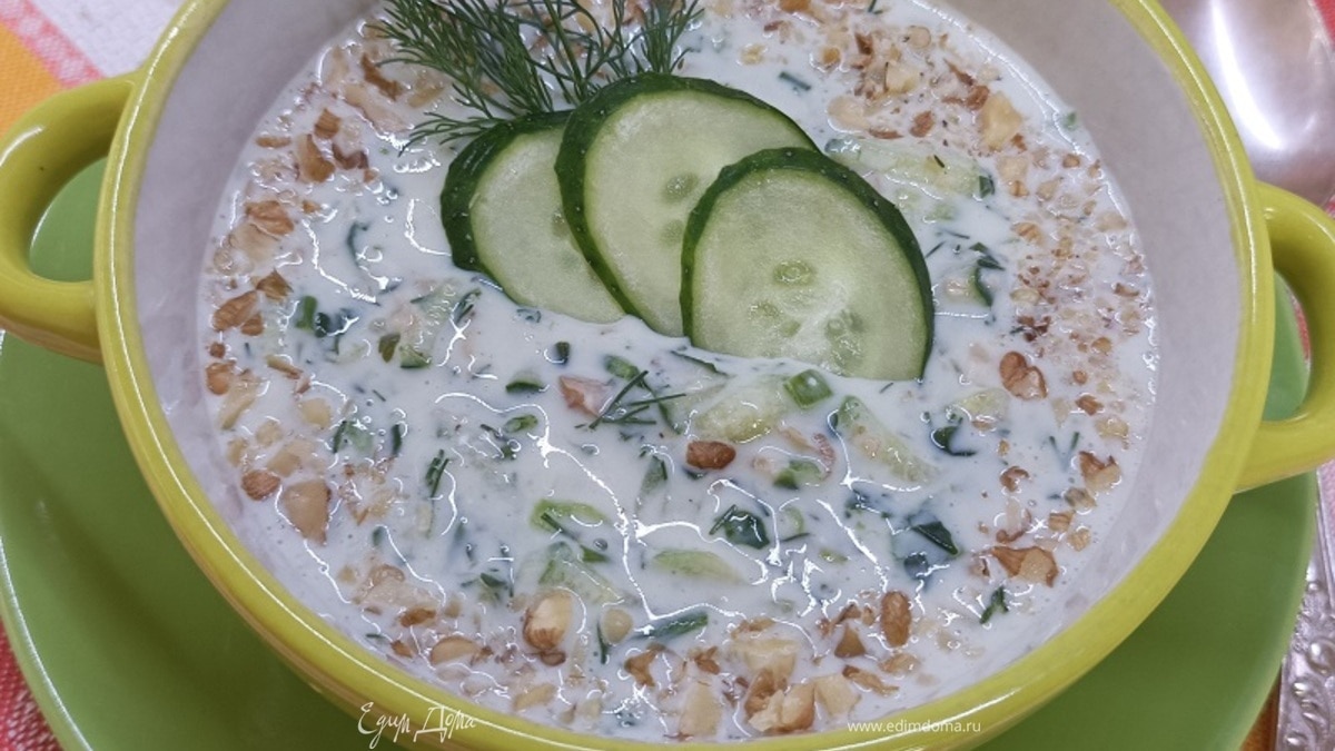 Вариант летнего холодного супа. Быстро готовится, ароматный, орешки делают его относительно сытным. Готовить можно и на йогурте, и на сметане.