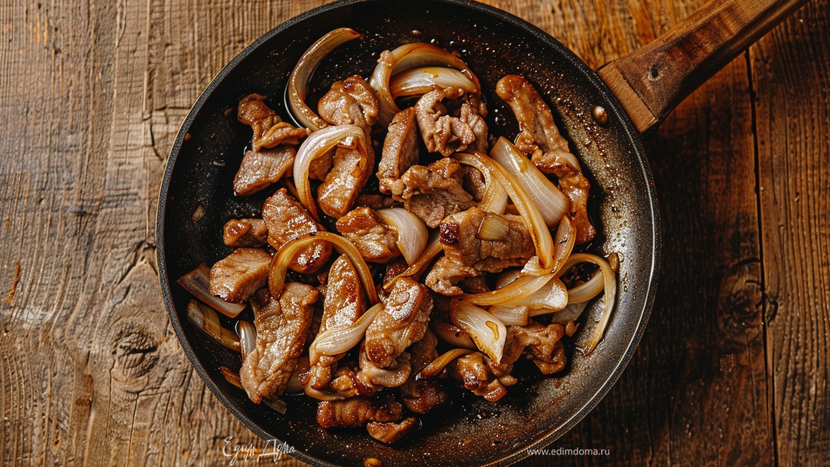 - Шаг 3Влейте соевый соус, перемешайте, убавьте огонь и тушите под крышкой 5 минут. Посолите (если нужно) и поперчите по вкусу. Подавайте мясо горячим.