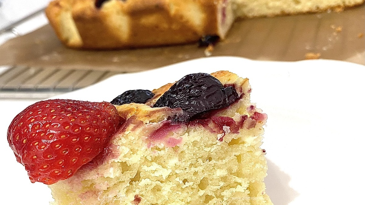 В форму 40 x 25 см выложить пекарскую бумагу. Перелить тесто. Черешню/вишню/клубнику — выбирайте любую ягоду по своему вкусу. У меня черешня. Очистить от косточек, положить сверху на тесто. Выпекать в заранее разогретой до 170°C духовке в режиме «верх-низ» без конвекции 45–50 минут. - Шаг 3