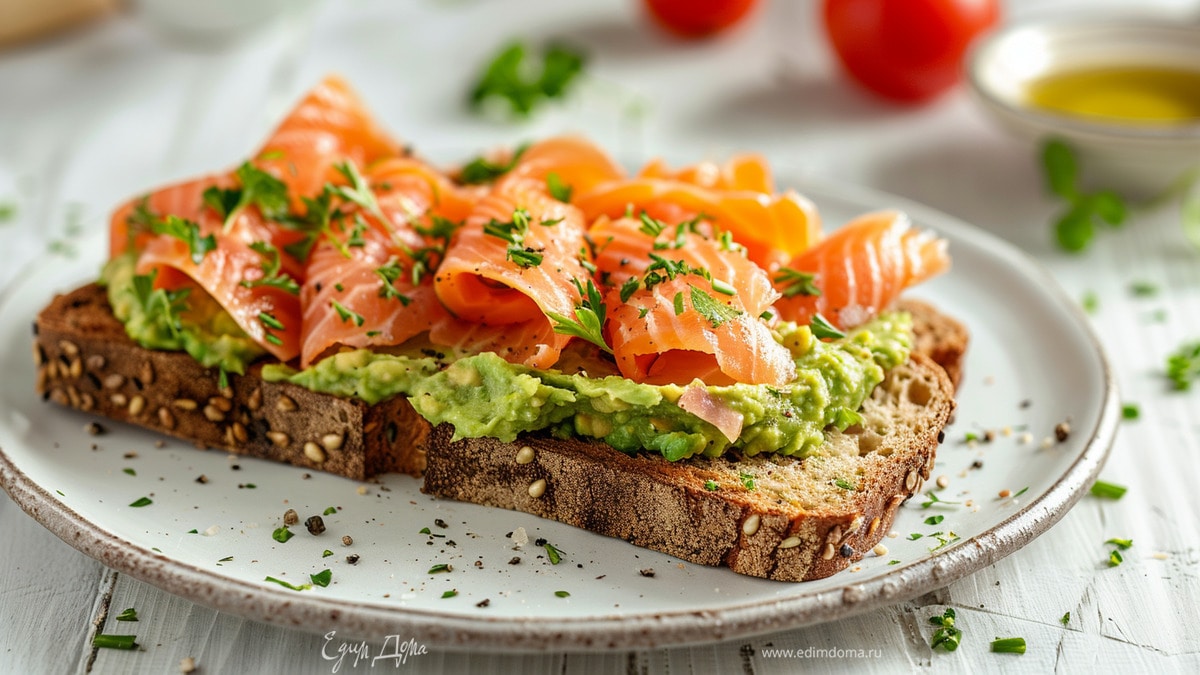 Намажьте размятое авокадо на каждый тост. Сверху выложите ломтики слабосоленой форели.