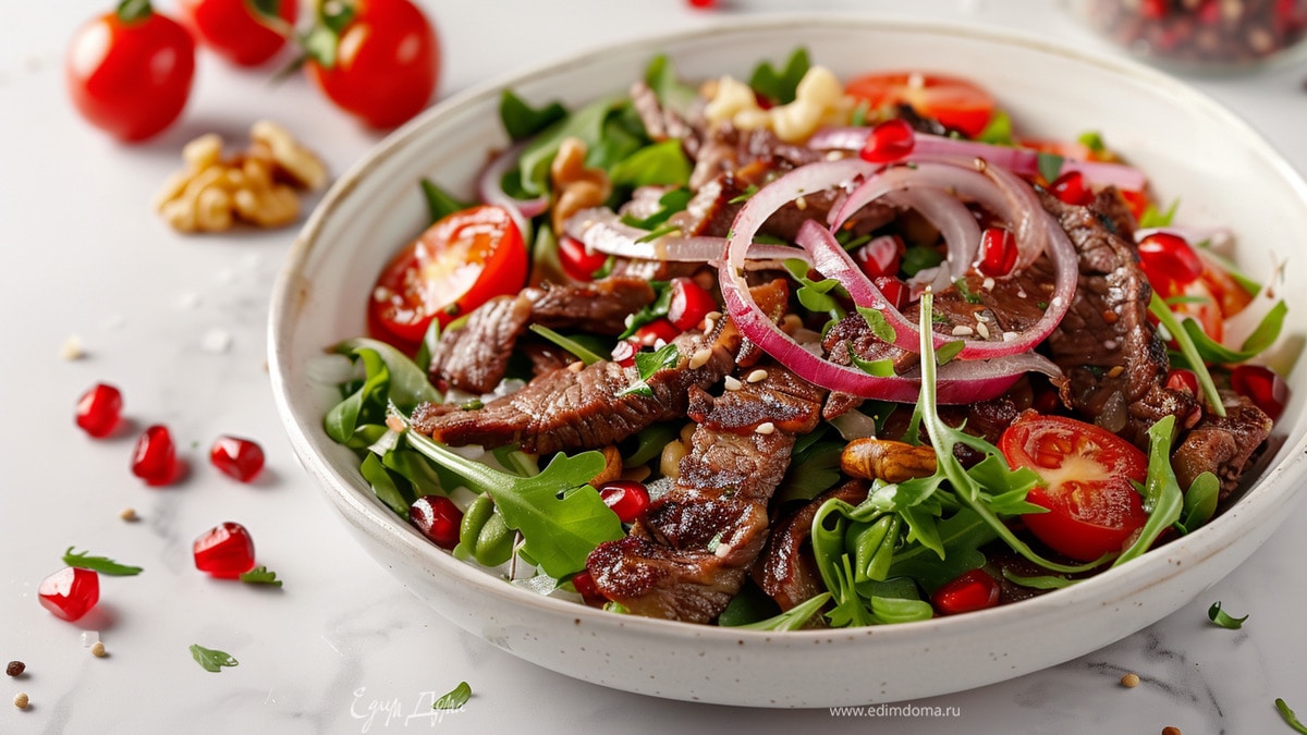 Теплый салат с говядиной, гранатом и грецким орехом