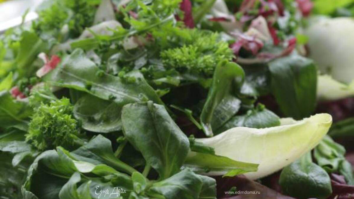 Если вы любите все зеленое и хрустящее, это ваш салат. Попробуйте сделать заправку без лимона или уксуса, травки тогда заиграют ярче, а не понравится — всегда можете добавить чего-нибудь кисленького. Вместо шнитт-лука подойдет обычный зеленый лук, а еще можно положить в салат горсть листьев одуванчика. Замечательно с рыбой или к цыпленку на гриле.