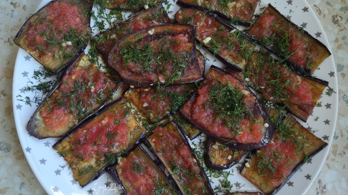 Жареные баклажаны с помидором и чесноком