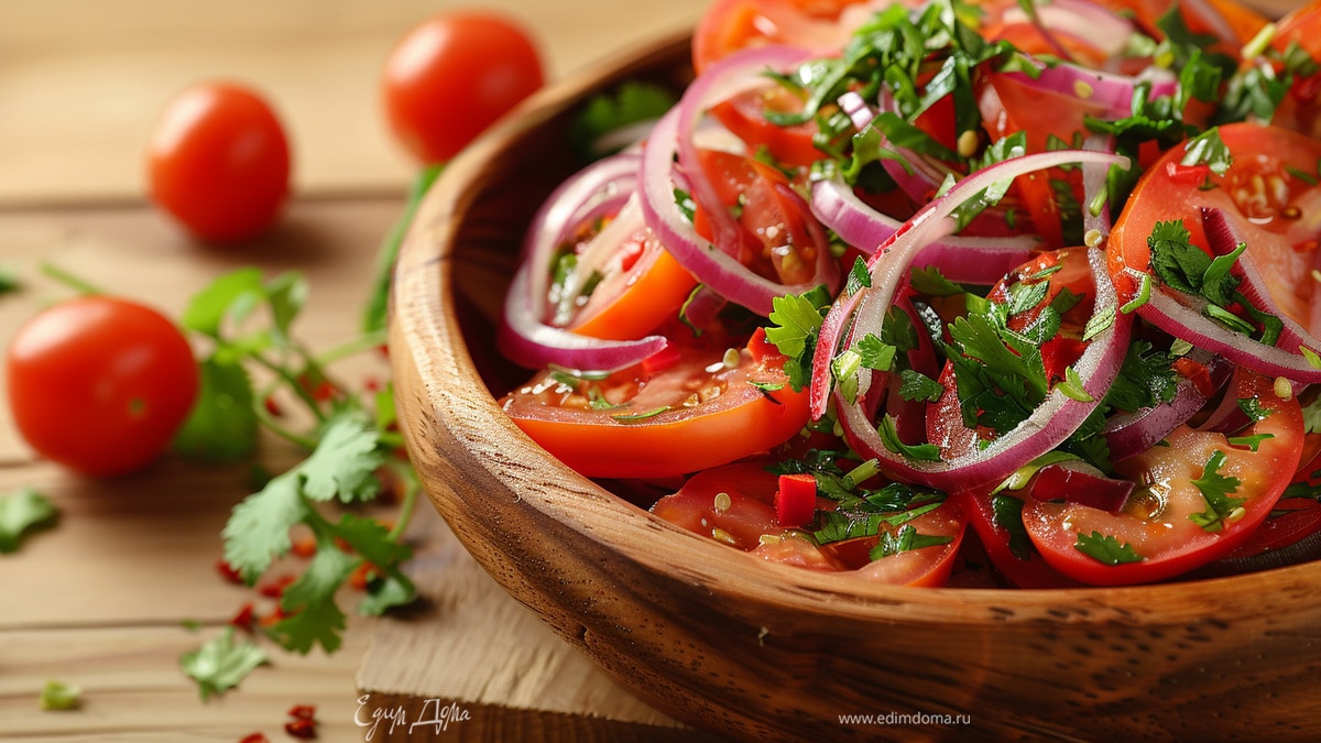 Попробуйте сочный узбекский салат «Ачичук»! Всего несколько простых ингредиентов: спелые помидоры, хрустящий лук, свежий острый перец и ароматная зелень.