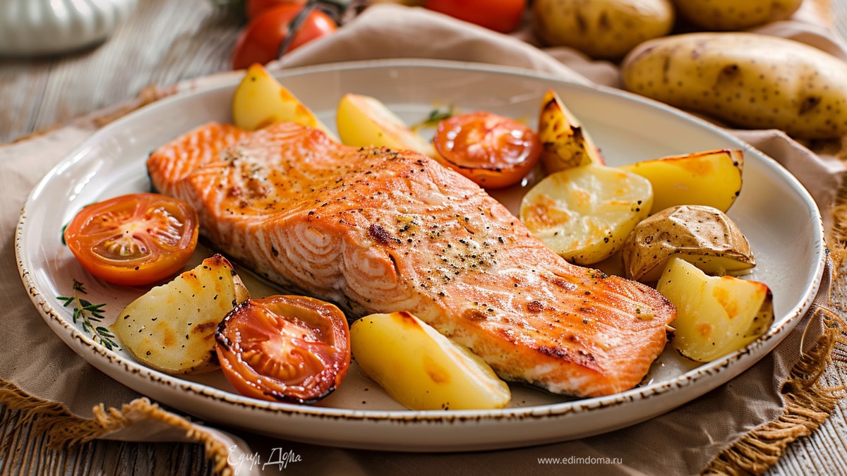 Семга, запеченная с молодым картофелем и черри