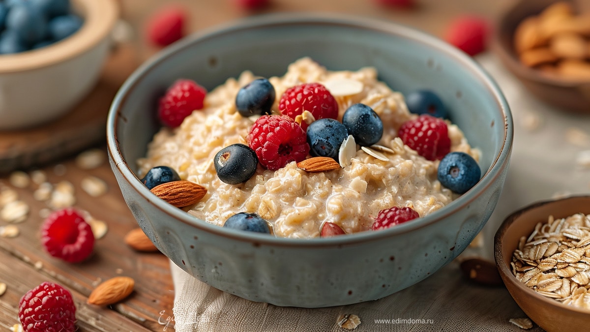- Шаг 3Когда овсянка будет готова, разложите ее по мискам. Украсьте кашу ягодами и посыпьте обжаренным миндалем. По желанию добавьте по 1 ч. ложке меда на каждую порцию для сладости. Приятного аппетита!