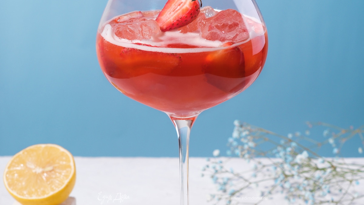 - Шаг 3В бокал положите лед и через стейнер или сито перелейте коктейль из шейкера. Украсьте готовый напиток слайсами клубники.