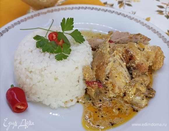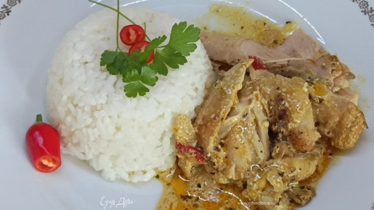 Затем всыпьте порошок карри и жарьте 1 минуту. Влейте сливки (кокосовое молоко), добавьте соль, базилик и перемешайте. Верните в кастрюлю окорочка, накройте крышкой и готовьте на медленном огне 1 ч 30 мин. Индейку пришлось готовить 2 часа и переворачивать, чтобы мясо равномерно тушилось. Готовую птицу переложите на тарелку. Отделите мякоть от костей, разберите на небольшие кусочки. - Шаг 4